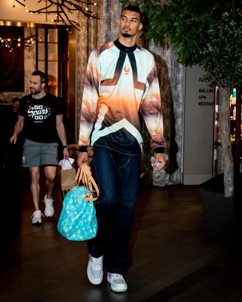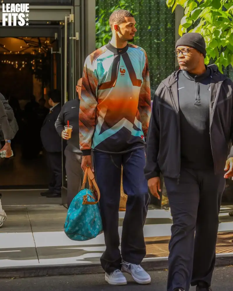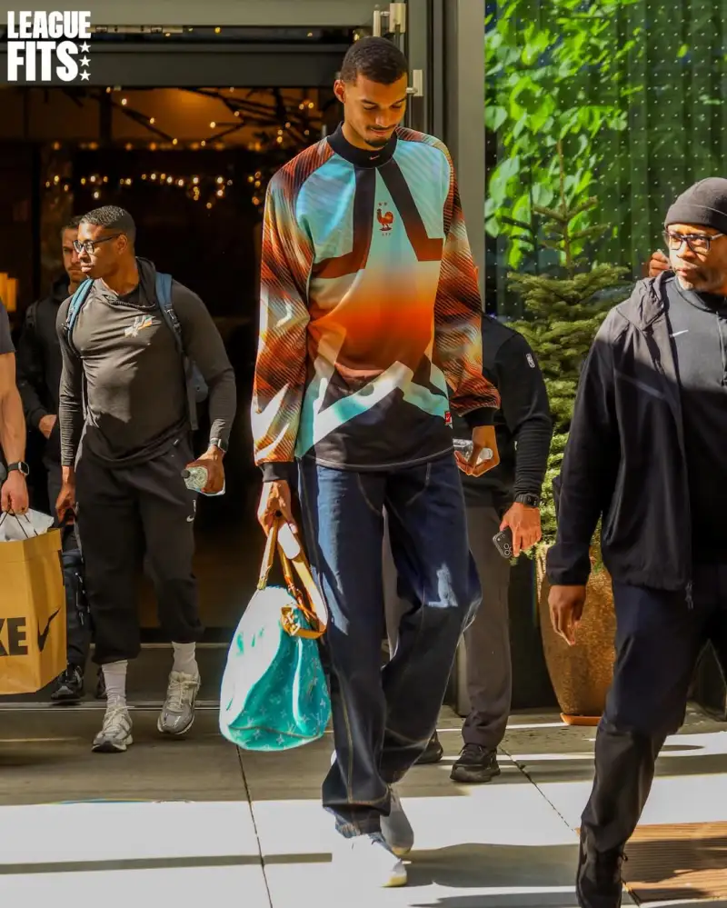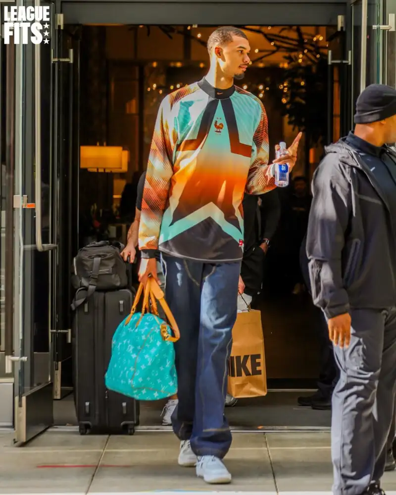 时尚媒体LeagueFits晒出维克托-文班亚马今日穿搭:身披耐克2026FIFA好莱坞守门员系列法国队球衣、手持LV Speedy 25小牛皮挎包。